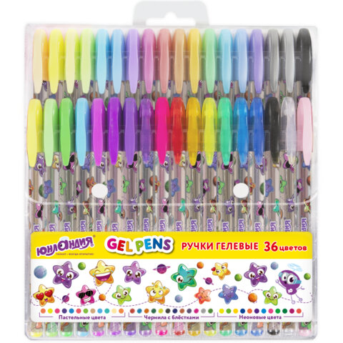 Ручки гелевые ЮНЛАНДИЯ, НАБОР 36 ЦВЕТОВ, узел 1 мм, линия письма 0,5 мм, 144451