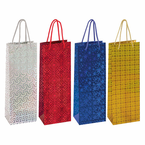 Пакет подарочный (1 штука) под бутылку 13x8,5x36 см, ЗОЛОТАЯ СКАЗКА голография, ассорти 4 цвета, 606608