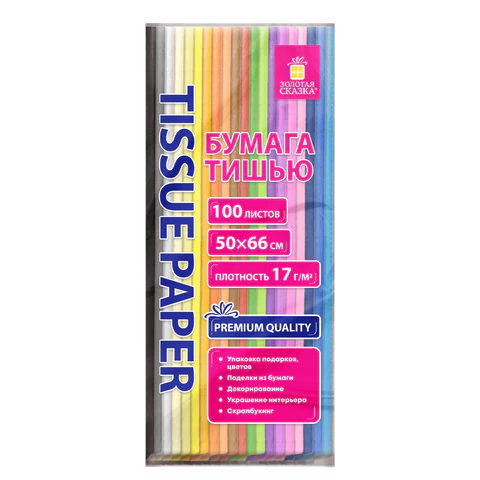 Цветная бумага ТИШЬЮ 17г/м2, 50х66см, 100 листов 20 цветов интенсив ассорти, ЗОЛОТАЯ СКАЗКА, 116496