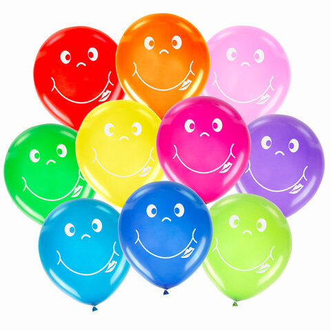 Шары воздушные ЗОЛОТАЯ СКАЗКА, 12" (30 см), КОМПЛЕКТ 50 штук, ассорти 10 цветов, с рисунком "Смайл", пакет, 105007
