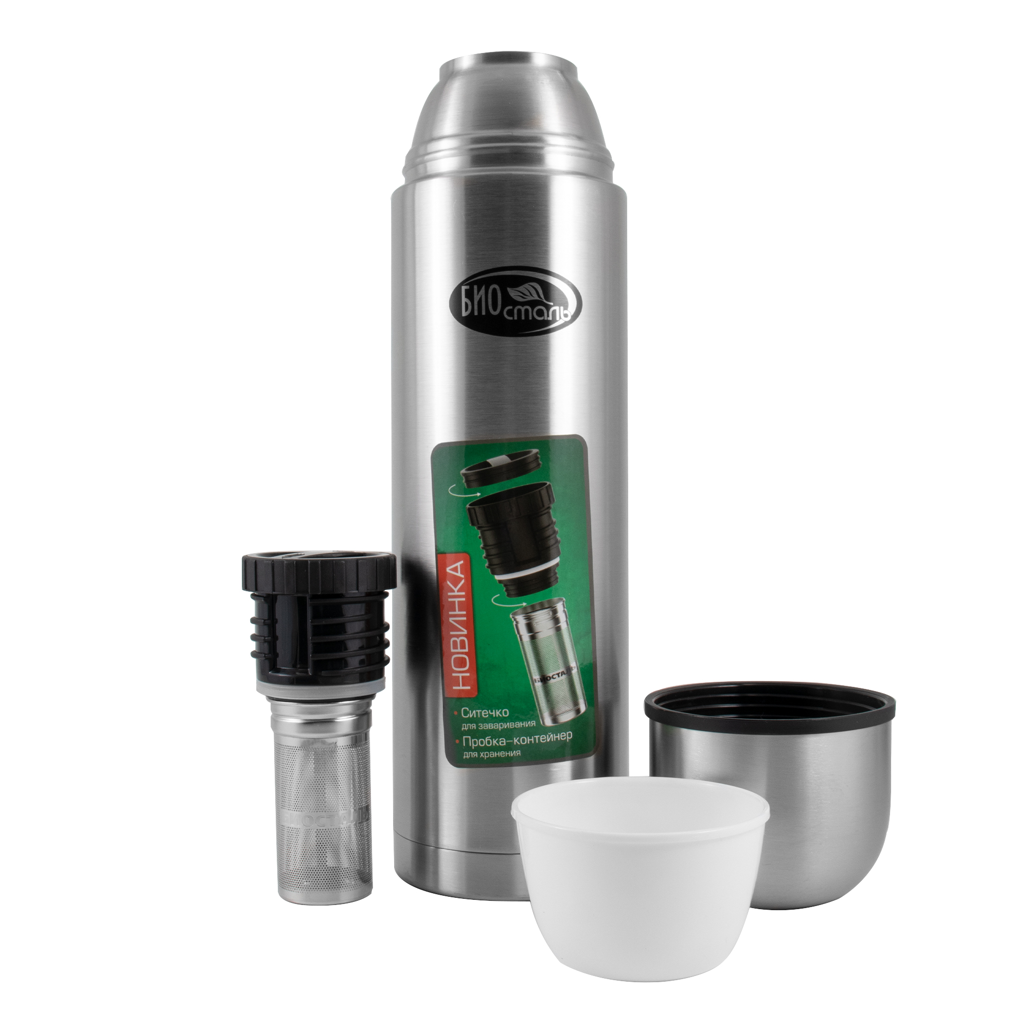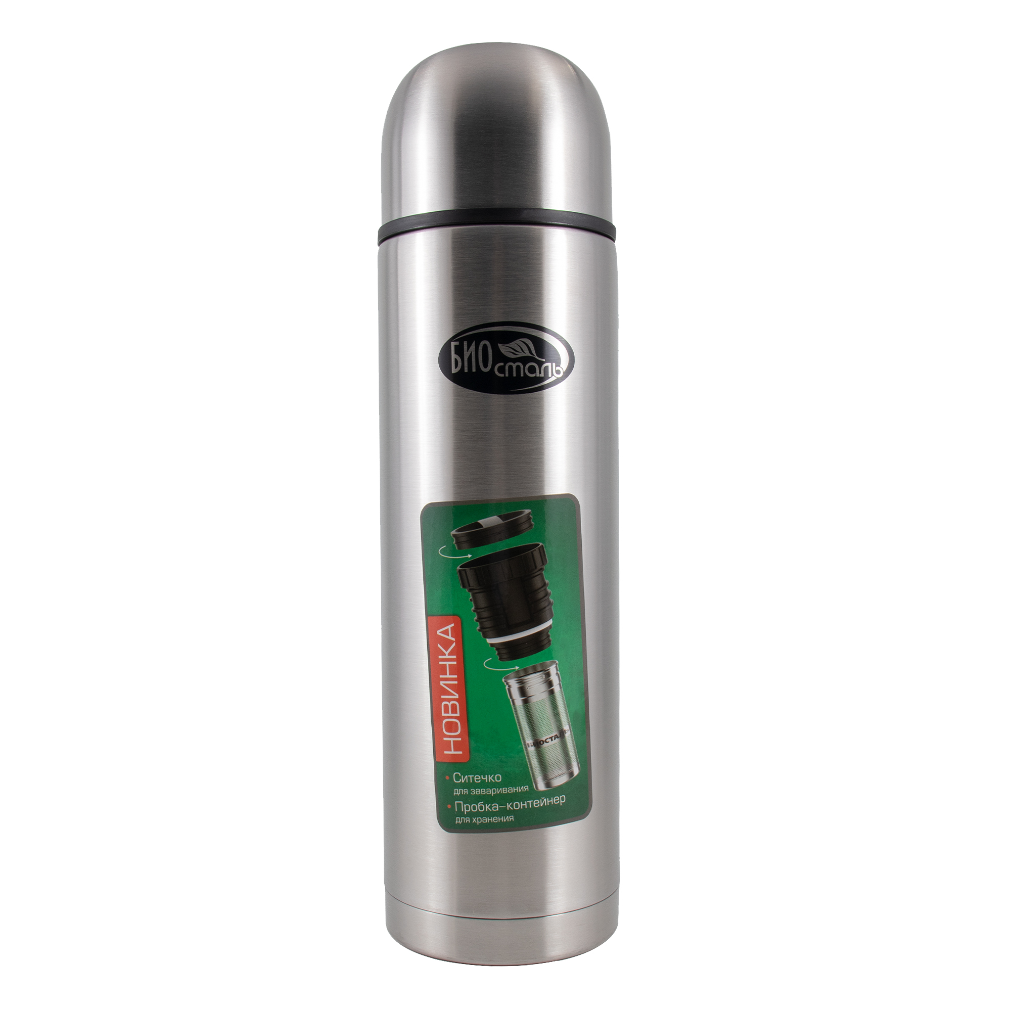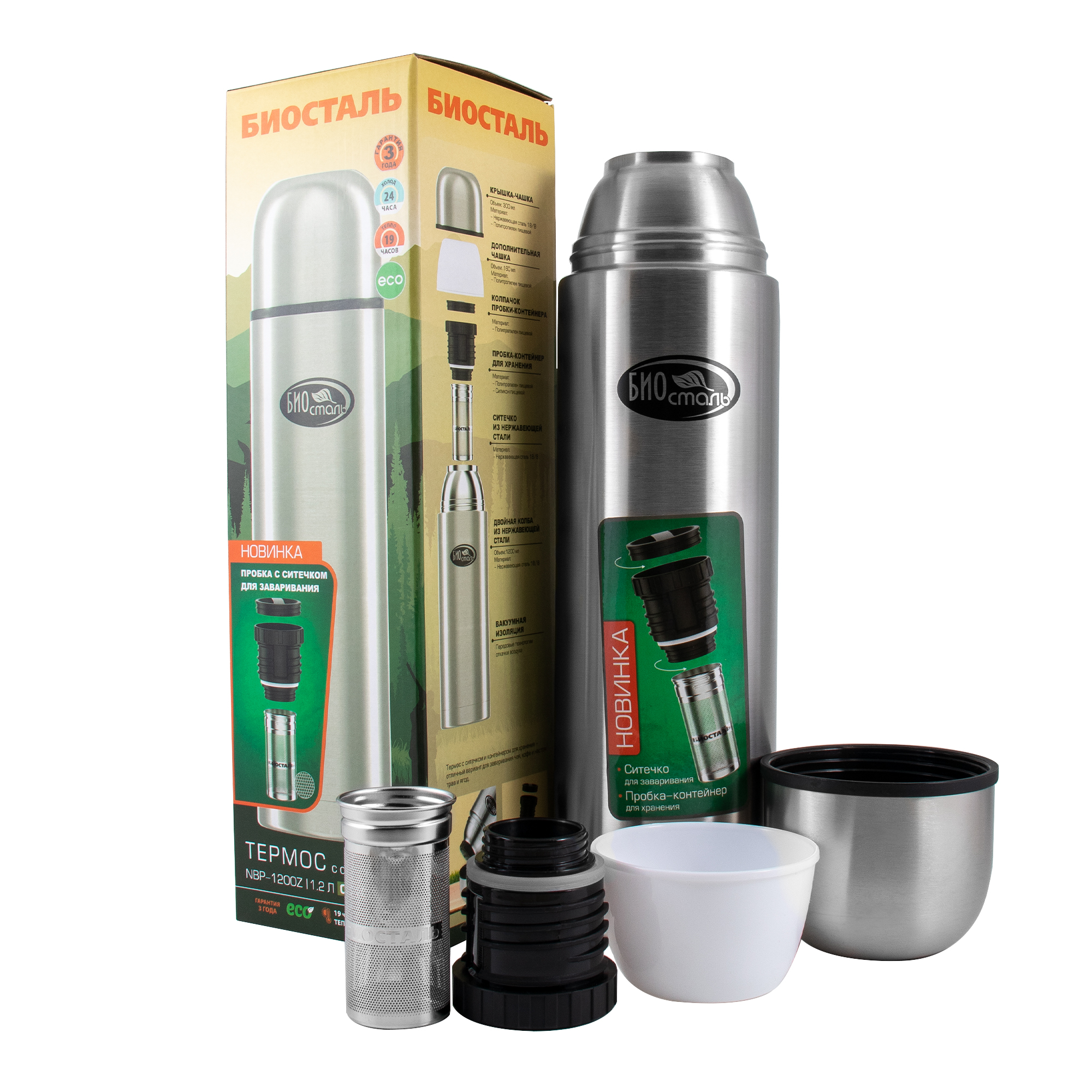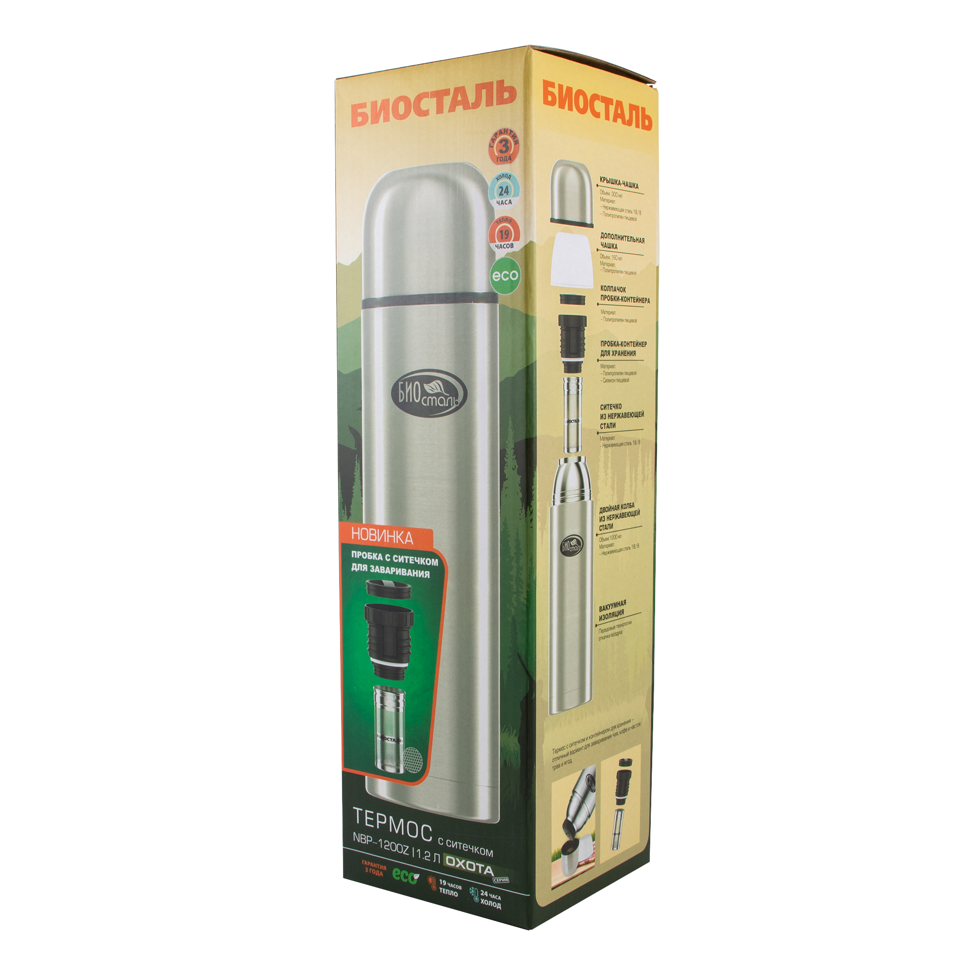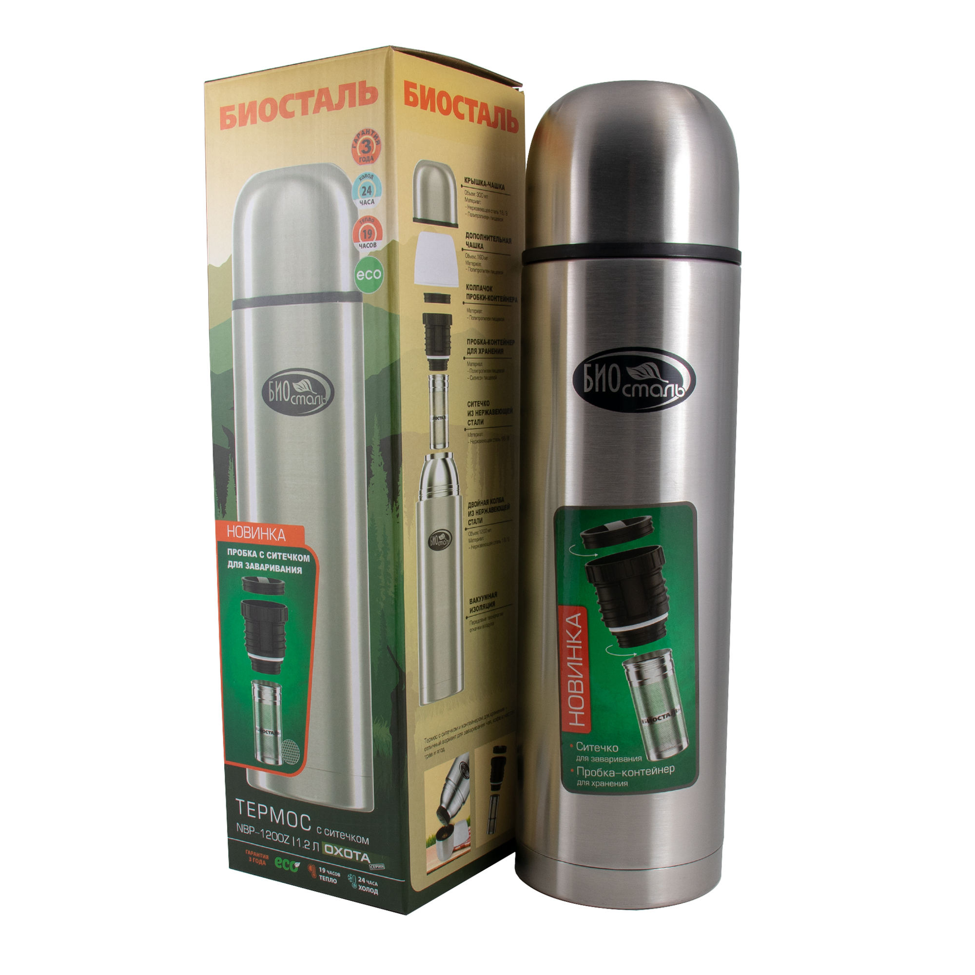 Термос "Биосталь-ОХОТА" с узкой горловиной и пробкой с ситечком, 1,2 л/12/