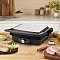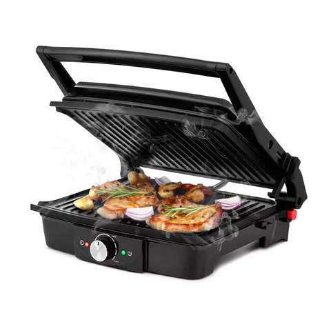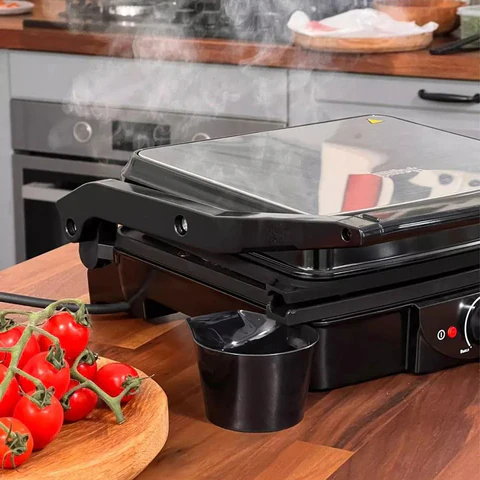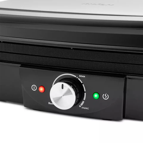 Управление простое и интуитивное: плавная регулировка температуры от 100–140°C до 180–220°C позволяет точно подобрать режим для каждого типа продуктов. Световые индикаторы показывают включение питания и активацию нагревательного элемента. Режим барбекю 180° позволяет откинуть крышку на всю ширину — гриль превращается в открытую жаровню, где можно одновременно готовить на двух поверхностях. Для этого предусмотрена специальная кнопка на корпусе.