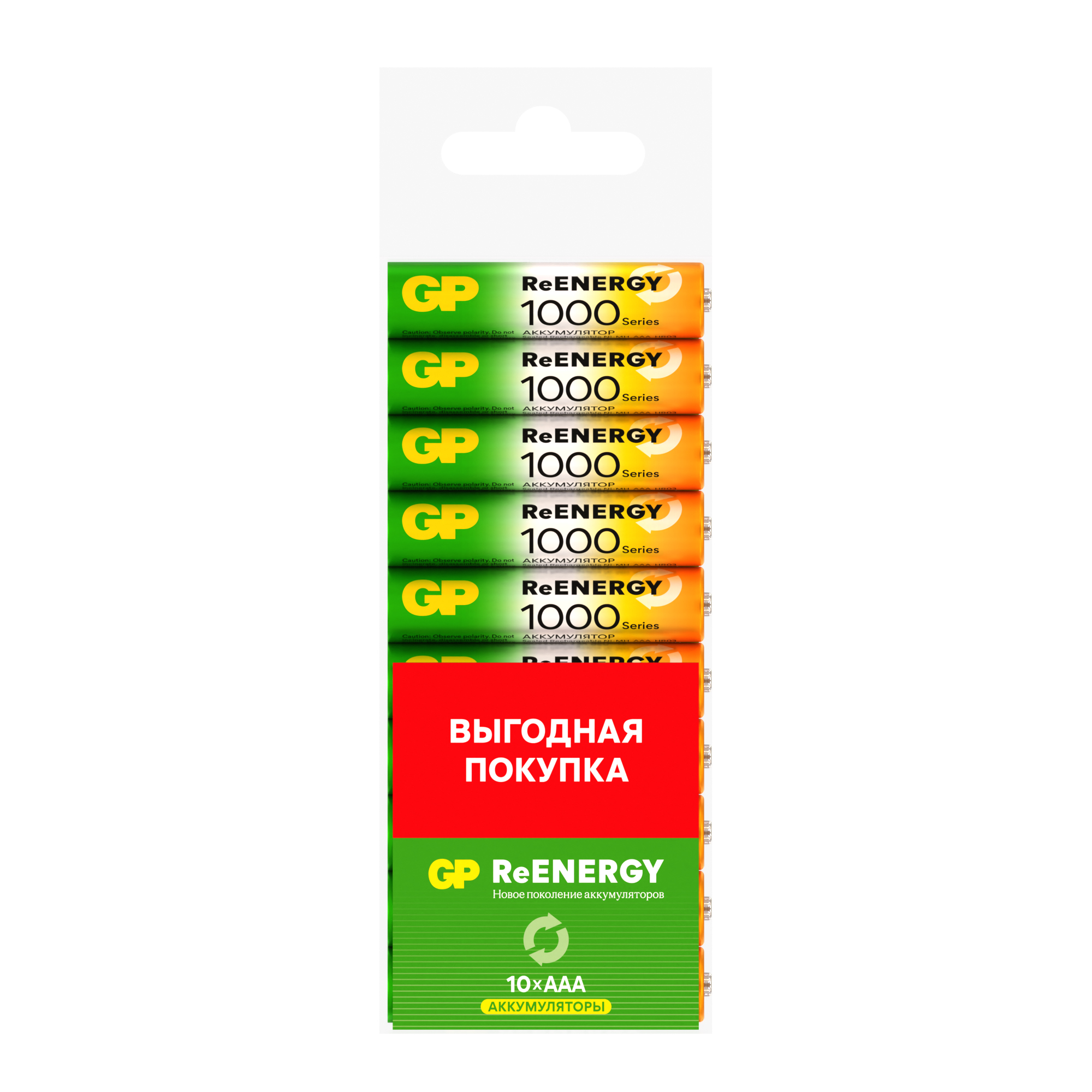 Экономичный набор из 10-ти энергоёмких никель-металлгидридных аккумуляторов типоразмера AAА мгновенно обеспечат питанием множество ваших приборов и устройств с высоким энергопотреблением – дома, на даче, в офисе, гостинице, на всевозможных мероприятиях<br/><br/>Основные преимущества<br/><br/>Мощные энергоёмкиеNi-MH аккумуляторы GP1000 можно использовать в бытовых, электронных, цифровых устройствах самого различного назначения. Батареи прекрасно подходят для приборов с высоким потреблением энергии, таких как фото- и видеотехника, портативные аудиоустройства, фонари, сигнализации, детские игрушки на радиоуправлении. <br/><br/>Комплект из 10-ти батарей даёт вам возможностьобеспечить питанием сразу несколько энергоёмких устройств. К примеру, фототехнику и вспышки на торжественных мероприятиях. Теперь вы можете не опасаться, что приборы откажутся работать в самый ответственный момент – вы сможете быстро заменить на новый исчерпавший энергию аккумулятор, а его поставить на подзарядку.<br/><br/>Новые Ni-MH аккумуляторы GP мощные, с равномерным расходованием энергии. Это обеспечивает их долговечность. На одном заряде элементы питания способны проработать существенно дольше обычных одноразовых батареек.<br/><br/>Подзарядить аккумулятор можно в любой момент, что позволяет сделать отсутствие у новых батарей эффекта памяти. <br/><br/>При соблюдении условий хранения через 2 года батареи сохранят не менее 80% своей изначальной энергии. <br/><br/>Аккумуляторы способны работать без потери своих рабочих характеристик и в жару, и в мороз (температурный диапазон – от -20°C до +54°С).<br/><br/>Экономичность<br/><br/>Приобретение нового большого набора GP 100AAAHC-CRB10позволит вам немало сэкономить – один никель-металлгидридный аккумулятор GP выдерживает до 500 циклов перезарядки и способен заменить собой более 2500 обычных одноразовых батареек.<br/><br/>Безопасность<br/><br/>При производстве аккумуляторов нового поколения от GP не используются тяжёлые металлы и вредные примеси. Батареи не текут и при надлежащей утилизации не представляют опасности для вашего здоровья и окружающей среды.<br/><br/>При установке батарей в слот соблюдайте правильную полярность. Не разбирайте и не деформируйте аккумуляторы. Держите их подальше от открытых источников огня. Не храните вместе с металлическими предметами. Не давайте детям в качестве игрушек.
