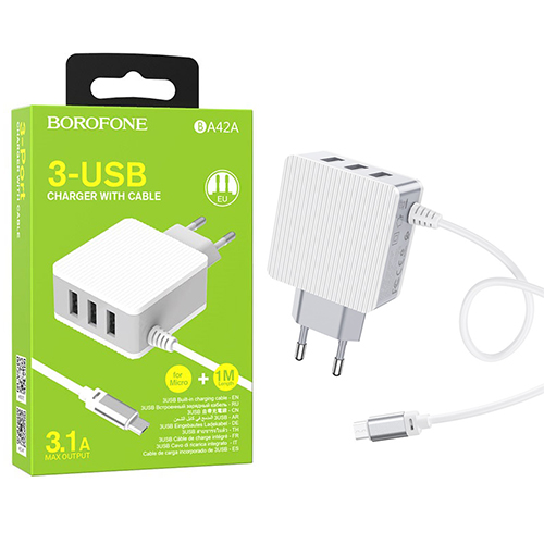 Зарядное устройство сетевое " Borofone " BA42A Sage, белое, 3,1А, 3 USB, пластик, кабель micro USB, 1м