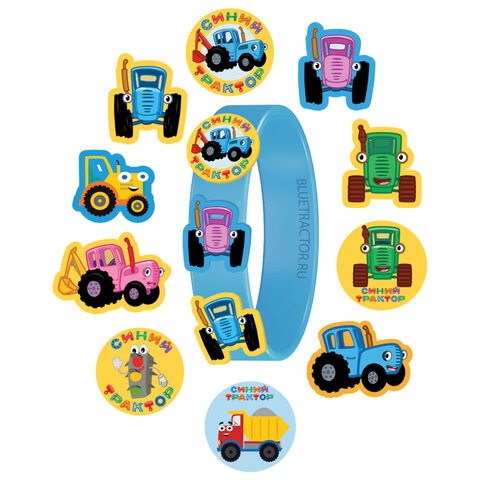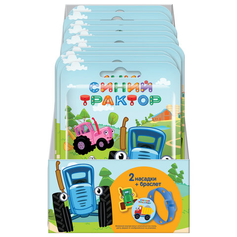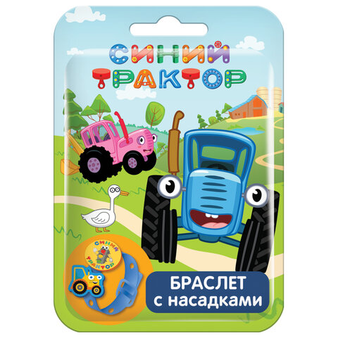 В качестве коллекционных вложений внутри упаковки – браслет сразу с двумя съёмными насадками. Аксессуар украшают забавные фигурки по сюжетам мультсериала "Синий трактор". Браслет длиной 20 см фиксируется на запястье при помощи пряжки. Наличие нескольких отверстий упрощает регулировку по объему.
