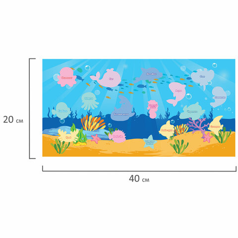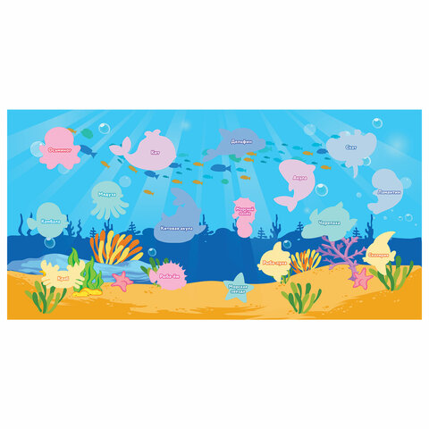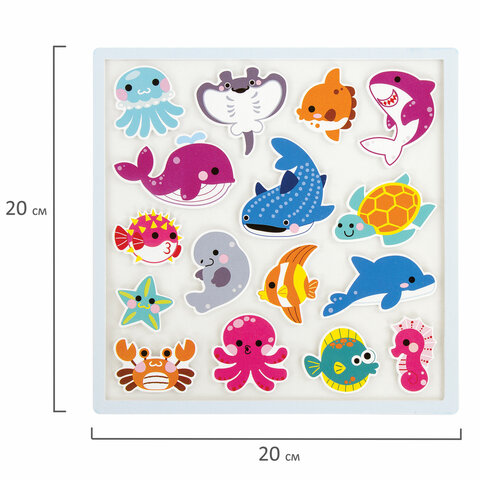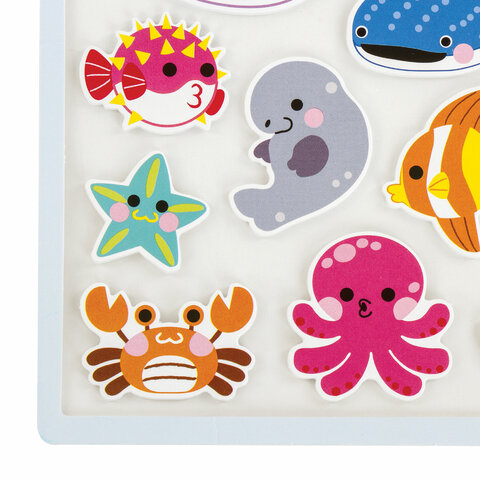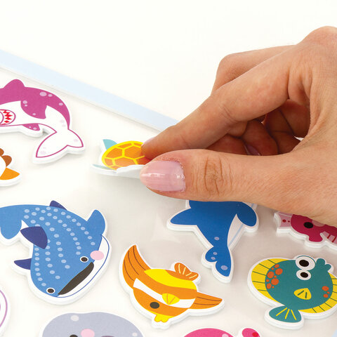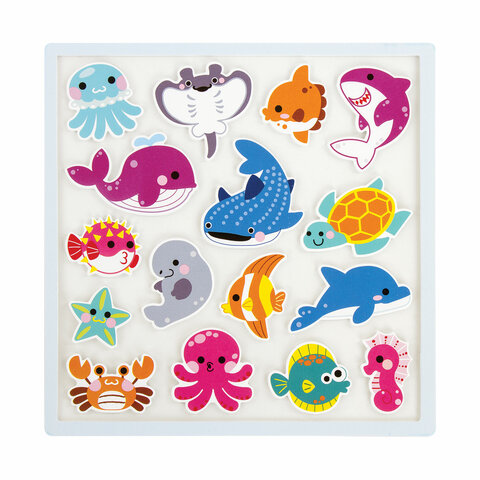 В набор входит 16 крупных объемных наклеек в виде различных морских обитателей, а также картонное поле размером 20*40 см (поставляется в сложенном виде) с определенными местами для нанесения наклеек. Место для каждой наклейки на поле подписано соответствующим образом, например, кит, медуза, дельфин и т.д. Таким образом, в ходе игры ребенок знакомится с названием и внешним видом животного.