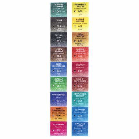 Акварельные краски созданы из высококачественных пигментов и гуммиарабика, без добавления примесей, что обеспечивает чистоту и насыщенность каждого цвета, а также получаемых при смешивании оттенков. Краски обладают отличной размываемостью и разносимостью, сохраняют оттенки после высыхания, высокоустойчивы к воздействию солнечного света.