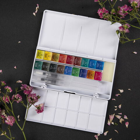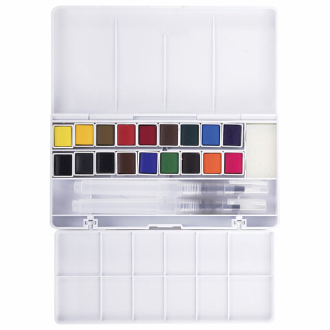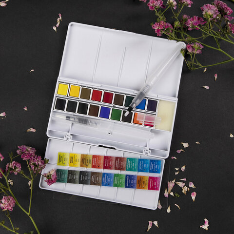 Акварель в кюветах поставляется в пластиковом пенале с палитрой, две кисти с резервуаром в комплекте.