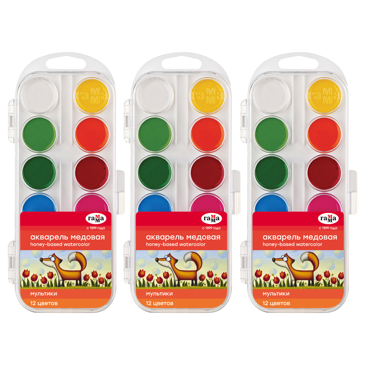 Акварель Гамма "Мультики", медовая, 12 цветов, без кисти, пластик. упак., европодвес NEW (3шт)