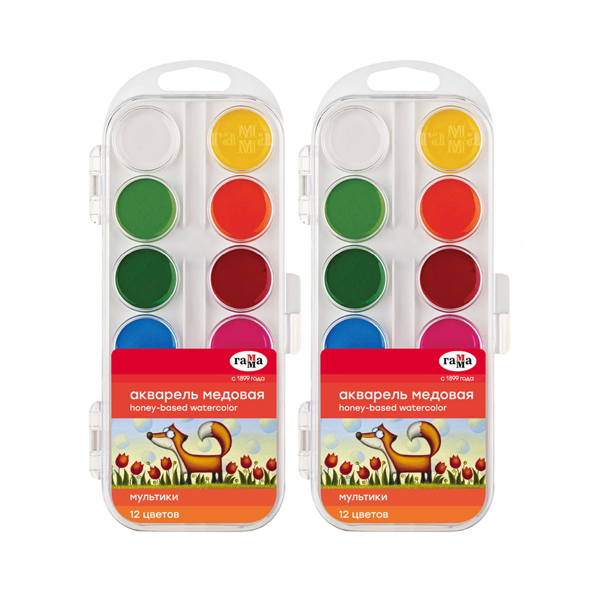 Акварель Гамма "Мультики", медовая, 12 цветов, без кисти, пластик. упак., европодвес NEW (2шт)