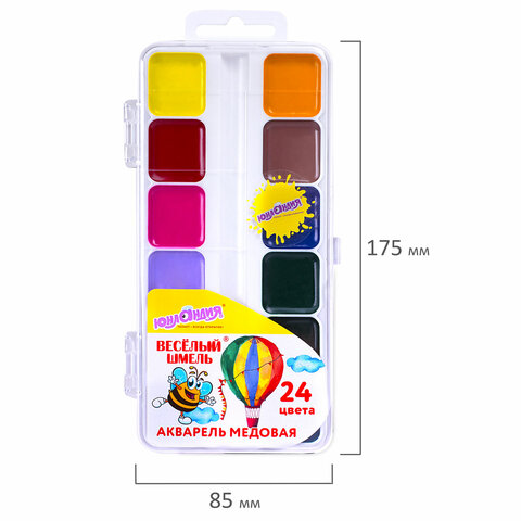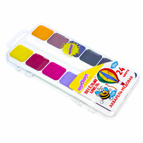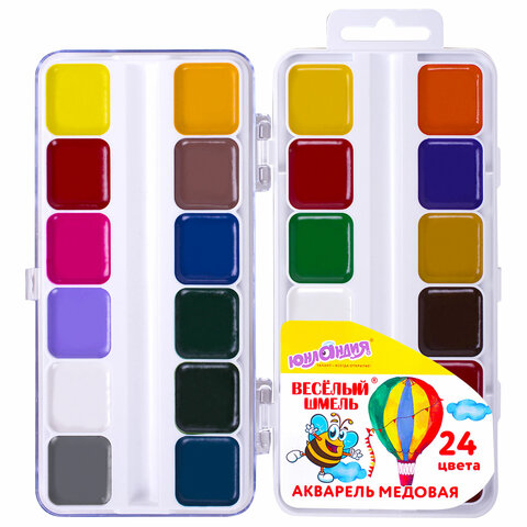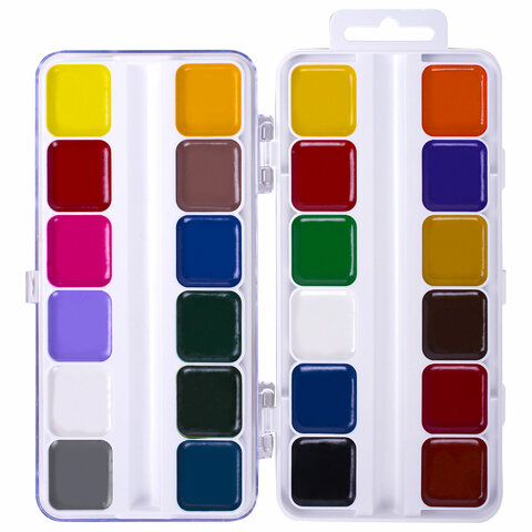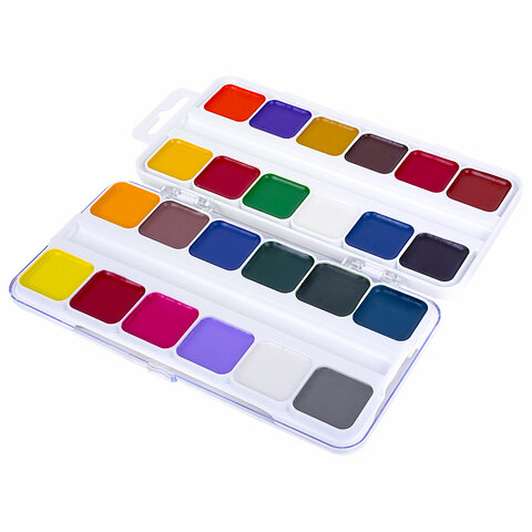 24 ярких насыщенных цвета отлично смешиваются между собой и позволяют создать множество оттенков, обеспечивают однородное окрашивание. Краски быстро высыхают и не портятся со временем. Безопасны для детей, нетоксичны. Выпускаются в пластиковом пенале с прозрачной крышкой, квадратной формой кювет и отделением для кисточки. Упаковка обладает компактными размерами и легким весом.