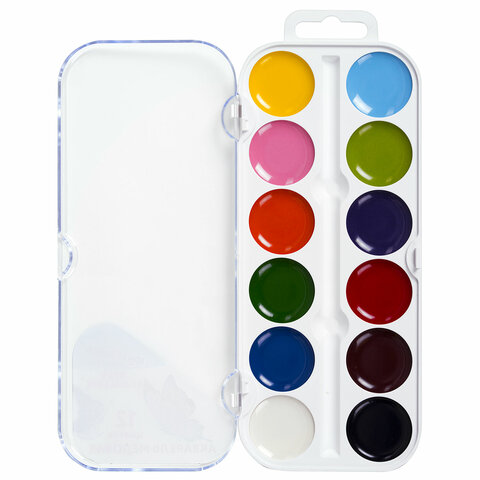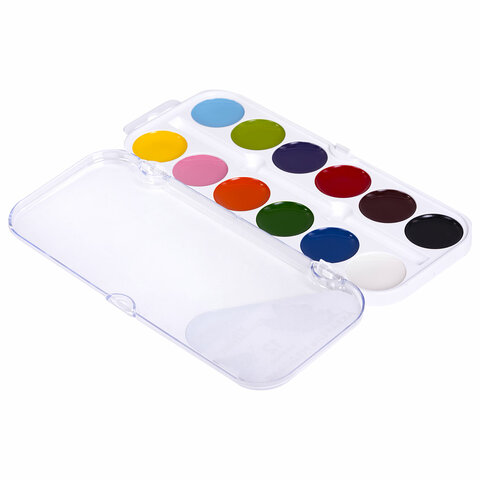 12 ярких насыщенных цветов отлично смешиваются между собой и позволяют создать множество оттенков, обеспечивают однородное окрашивание. Краски быстро высыхают и не портятся со временем. Безопасны для детей, нетоксичны. Выпускаются в пластиковом пенале с прозрачной крышкой, круглой формой кювет и отделением для кисточки. Упаковка обладает компактными размерами и легким весом.