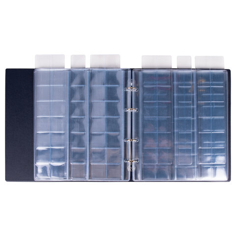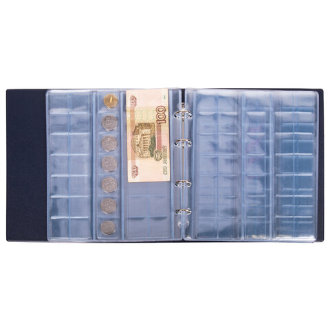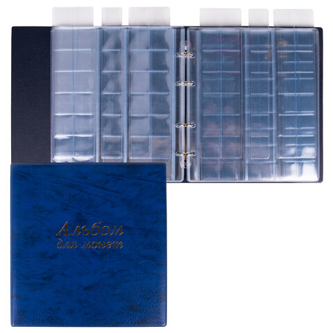 Альбом размером 253х238 мм выполнен из качественного кожзама и представлен в синем цвете. Укомплектован девятью листами-вкладышами с выдвижными карманами: 4 листа с карманами размером 23х26 мм (216 шт.), 4 листа с карманами размером 28х34 мм (140 шт.) и 1 лист с карманами размером 37х40 мм (24 шт.). Итого альбом вмещает 380 монет диаметром до 38 мм. Также возможно вертикальное расположение купюр в карманах альбома. Материал листов - ПВХ.