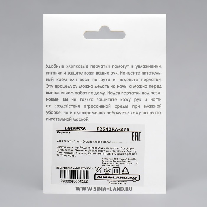 Перчатки хлопковые, размер M, пара, в картонной коробке, цвет белый