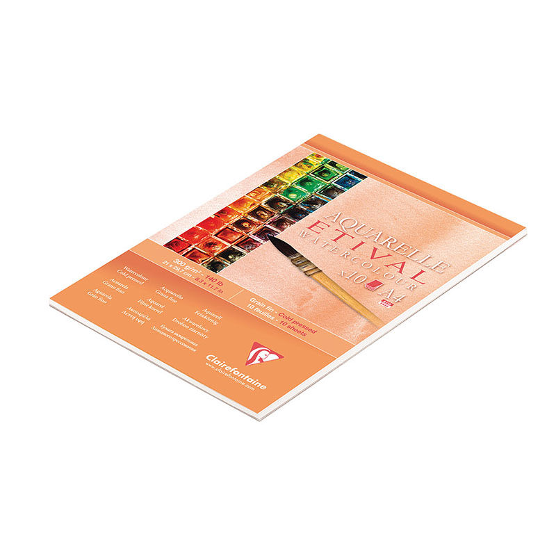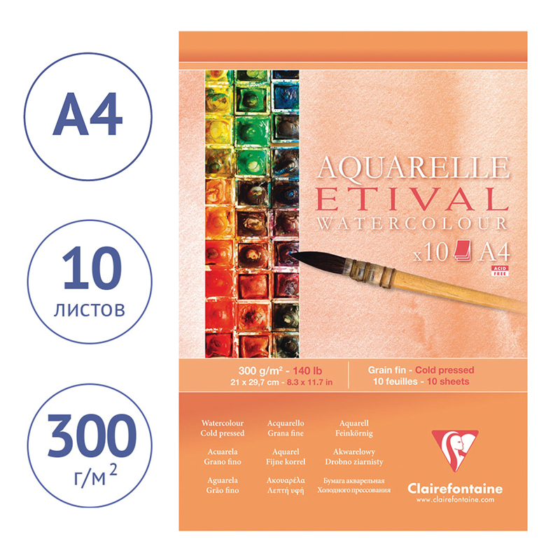 Альбом для акварели Clairefontaine «Etival» на склейке. Размер: 210*297 мм. Назначение: для акварели. Текстура внутреннего блока: зернистая. Материал обложки: картон. Бумага для акварели Etival – это выбор начинающих художников. Альбом всегда можно взять с собой, а склейка позволяет отделить лист с готовым рисунком.<br/>• Формат: А4;<br/>• Кол-во листов: 10;<br/>• Вид скрепления: склейка;<br/>• Внутренний блок: акварельная бумага;<br/>• Плотность блока: 300 г/кв.м.; <br/>• Цвет блока: белый.