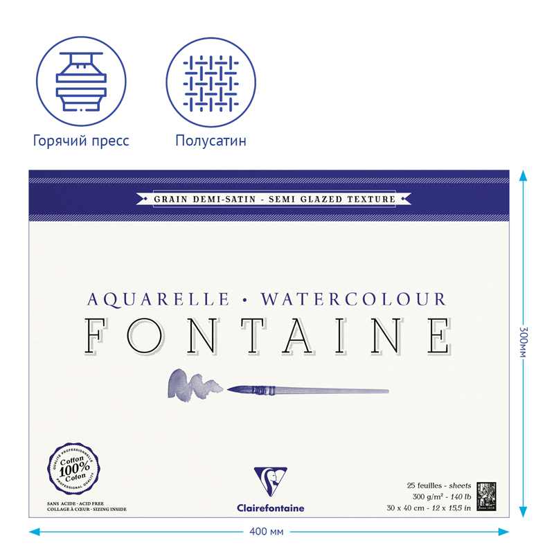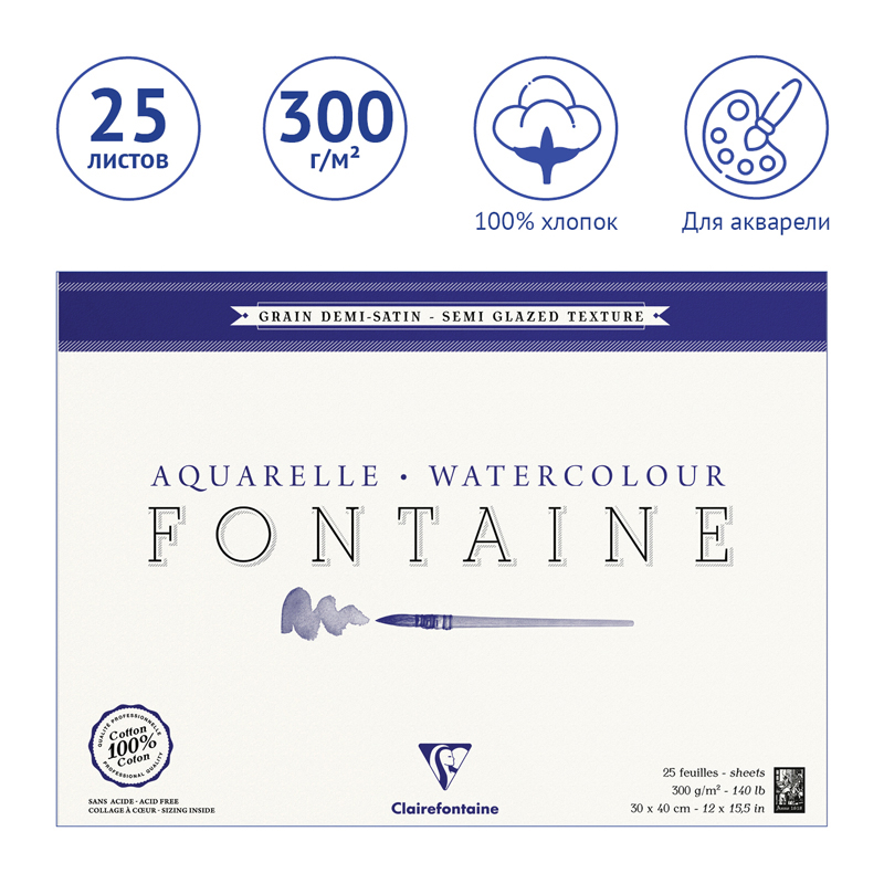 Бумага Clairefontaine линейки Fontaine серии Demi-satine – это бескислотная бумага из 100% хлопка, горячего прессования с почти гладкой поверхностью, но менее ровной, чем серия Grain satine. Размер: 300*400 мм. Она хорошо подходит для прорисовок мелких деталей, где явные очертания играют важную роль. Хлопковые волокна бумаги линейки Fontaine, полые, поэтому они способны впитывать воду, что особенно важно при работе акварелью. Эта бумага облегчает ретуширование и обладает прекрасной светопередачей.<br/>• Размер: 300*400 мм;<br/>• Тип скрепления: склейка;<br/>• Количество листов: 25;<br/>• Плотность блока: 300 г/кв. м;<br/>• Содержание хлопка: 100%.