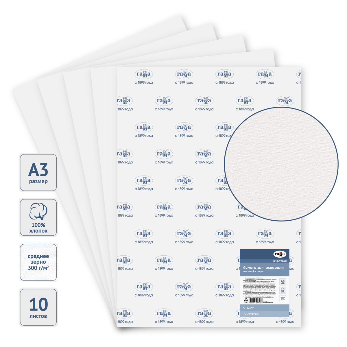 УЦЕНКА - Бумага для акварели, 10л., А3, Гамма "Студия", 300г/м2, среднее зерно, 100% хлопок