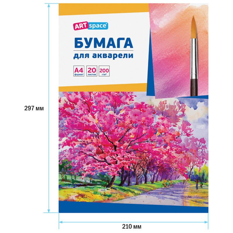 Папка для рисования акварелью ArtSpace из мелованного картона с внутренним блоком выполненном специальной рисовальной чистоцеллюлозной бумаги формата А4 размером 297*210 мм, плотностью 200 гр/м2. Количество листов в упаковке – 20 штук.