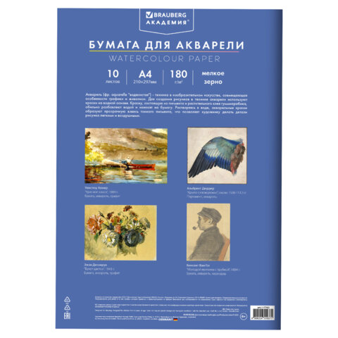 Папка для акварели содержит 10 листов формата А4 (210х297 мм). Белизна 100% Качественные листы высокой плотности 180 г/м2 устойчивы к истиранию, воздействию влаги, обеспечивают чистую реалистичную передачу цвета. Обложка выполнена из мелованного картона.