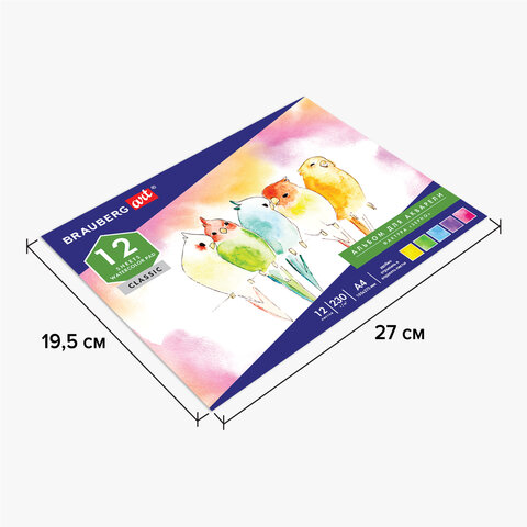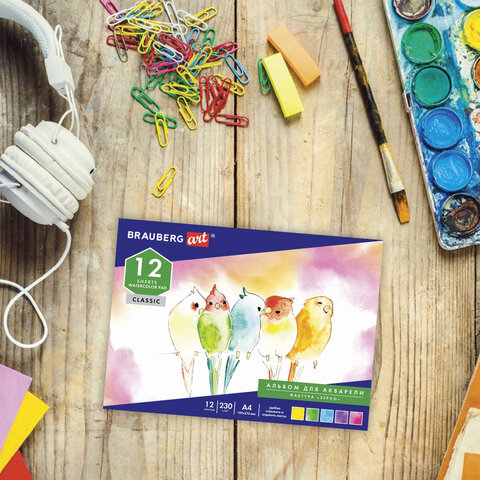 Альбом для акварели BRAUBERG содержит 12 листов формата А4 (195х270 мм), специально предназначенных для рисования всеми видами водорастворимых красок. Качественные листы высокой плотности 180 г/м2 устойчивы к истиранию, воздействию влаги, обеспечивают чистую реалистичную передачу цвета. Акварельная бумага изготовлена по ГОСТ 7277-77. Белизна 100%. Текстура бумаги "зерно" подходит для разных техник рисования: как для детализированной живописи, так и для создания красивых зернистых эффектов. Обложка выполнена из мелованного картона.