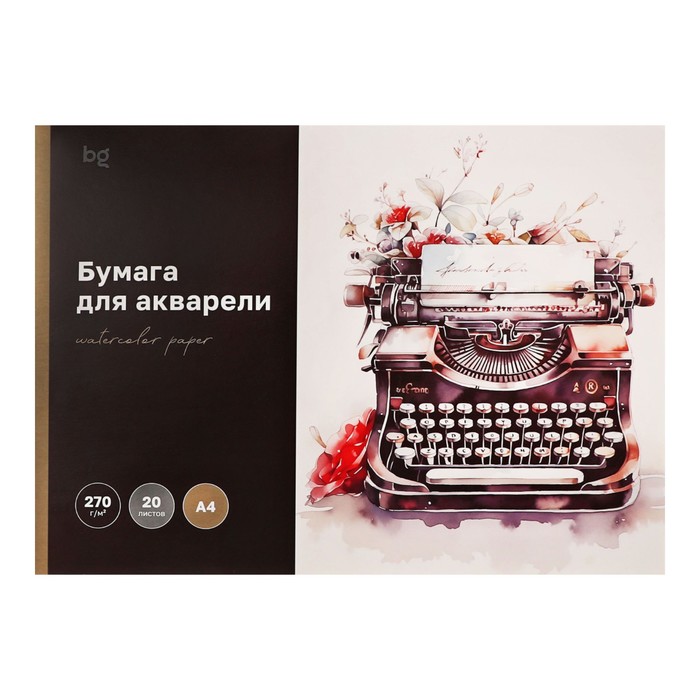 Бумага для акварели в папке А4, 20 листов, BG "Антикварная машинка", 270 г/м2