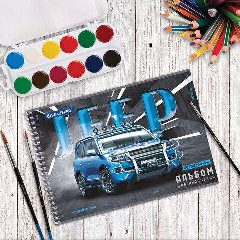 Содержит 40 листов плотностью 100 г/м2 формата А4 (195х285 мм). Красочная обложка выполнена из мелованного картона. Скрепление листов осуществляется с помощью евроспирали. Подходит для смешанных техник рисования: красками, карандашами и фломастерами.