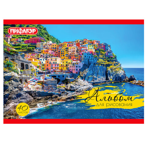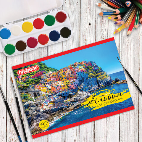 Содержит 40 листов плотностью 100 г/м2 формата А5 (200х148 мм). Красочная обложка выполнена из офсетной бумаги. Скрепление листов осуществляется с помощью скрепки. Подходит для смешанных техник рисования: красками, карандашами и фломастерами.