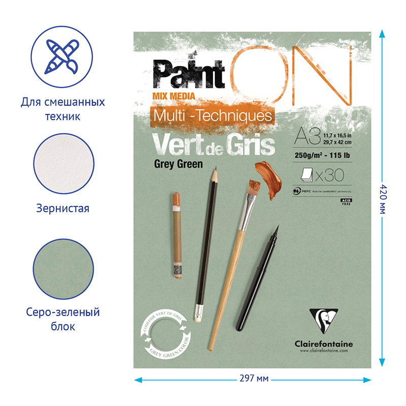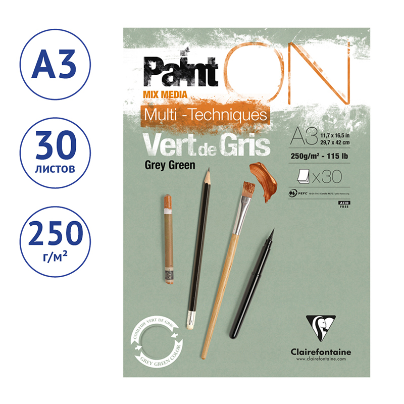 Альбом для смешанных техник "Paint'ON" – лучшая линейка от французского производителя Clairefontaine. Качество и плотность 250 г/м2 делают бумагу устойчивой к царапинам, позволяют наносить материал в несколько слоев. Серо-зеленый оттенок и легкое зерно придают контрастность и глубину рисунку. Легкое зерно позволяет использовать разные инструменты для работы. Подходит для работы карандашом, углем, пастелью, фломастерами, маркерами, тушью и гуашью. Вид крепления – склейка, позволяет легко отделить лист с готовым рисунком.