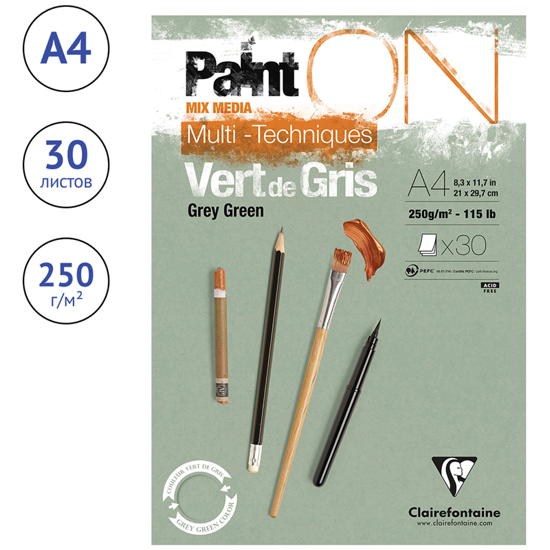 Скетчбук Clairefontaine для смешанных техник на склейке «Paint'ON» – лучшая линейка от французского производителя Clairefontaine. Скетчбук состоит из 30 листов формата А4 размером 210*297 см. Качество и плотность 250 г/м2 делают бумагу устойчивой к царапинам, позволяют наносить материал в несколько слоев. Серо-зелёный оттенок и легкое зерно придают контрастность и глубину рисунку. Легкое зерно позволяет использовать разные инструменты для работы. Подходит для работы карандашом, углем, пастелью, фломастерами, маркерами, тушью и гуашью. Вид крепления – склейка, позволяет легко отделить лист с готовым рисунком.<br/>• Формат: А4;<br/>• Кол-во листов: 30;<br/>• Вид скрепления: склейка;<br/>• Техника (назначение): для смешанных техник;<br/>• Внутренний блок: рисовальная бумага;<br/>• Плотность блока: 250г/м2;<br/>• Структура блока: лёгкое зерно;<br/>• Цвет блока: серо-зелёный.