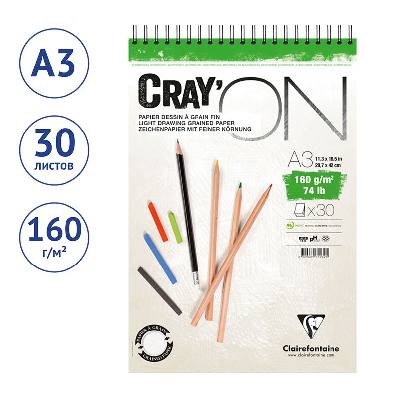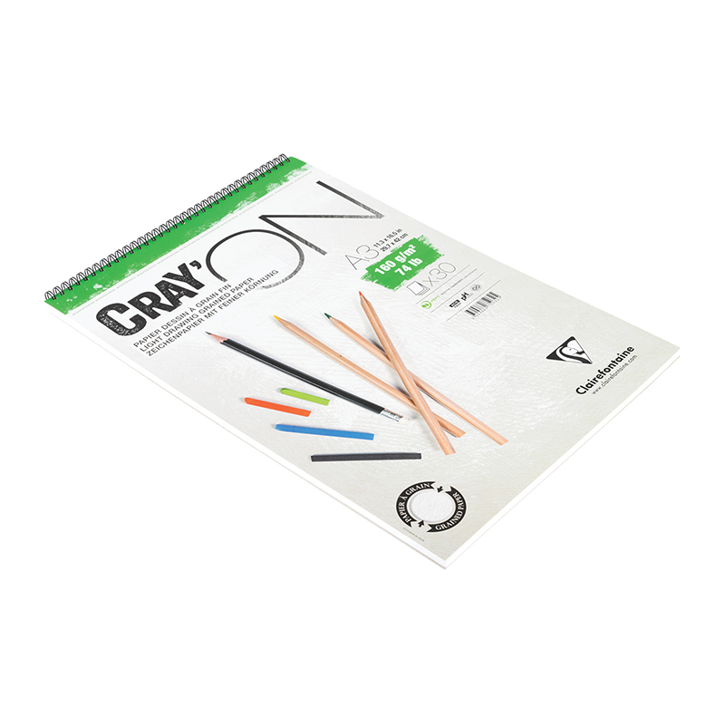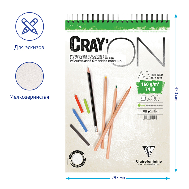Блокнот для эскизов и зарисовок "Cray'On" А3 формата. Плотность 160 г/м2 подходит для рисунков (набросков) и черчения, а также работы во влажных техниках (тушь, гуашь, краска). Бескислотная 100% целлюлозная бумага позволяет многократно вносить исправления в ваш набросок, при этом блок не повреждается. Внутренний блок – белый, имеет две разные поверхности: гладкую и мелкозернистую.