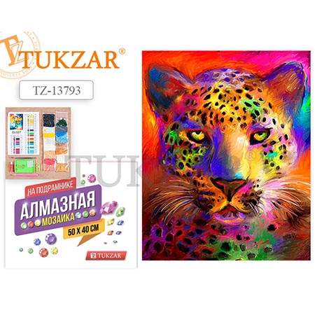 Картина алмазная " Tukzar " 40*50см Леопард, состав набора: холст на подрамнике, стразы, стилус, емкость для страз, клей, крепеж, полное заполнение, картонная упаковка