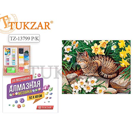 Картина алмазная " Tukzar " 40*50см Кот, состав набора: холст на подрамнике, стразы, стилус, емкость для страз, клей, крепеж, полное заполнение, картонная упаковка