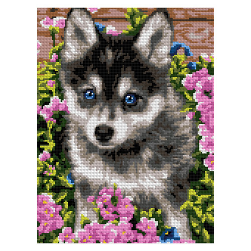 Картина алмазная " Lori " 30*40см Щенок хаски, полное заполнение, холст без подрамника с клеевой основой, комплект квадратных страз, стилус, лоток для страз, сухой клей, инструкция