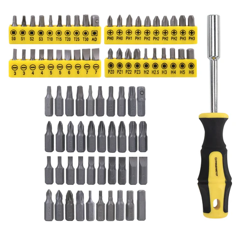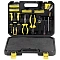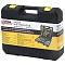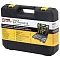 Инструменты размещены в ударопрочном кейсе с двумя застёжками и ручкой для удобной переноски. Каждый элемент прочно зафиксирован внутри и не выпадает при транспортировке. Углубления для бит и торцевых головок промаркированы по размеру, что облегчает поиск нужного инструмента.