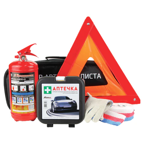 Набор автомобилиста АВТО: аптечка МИРАЛ, огнетушитель ОП-2,знак аварийный, трос, перчатки, 46442