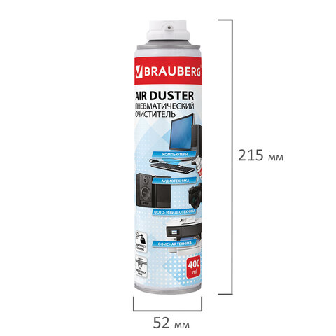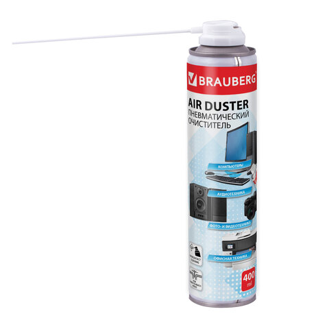 Баллон со сжатым воздухом BRAUBERG предназначен для бесконтактного удаления пыли и мелкого мусора из труднодоступных мест и внутреннего пространства компьютерной техники, аудио-, видео- и фотоаппаратуры, офисной и бытовой техники.