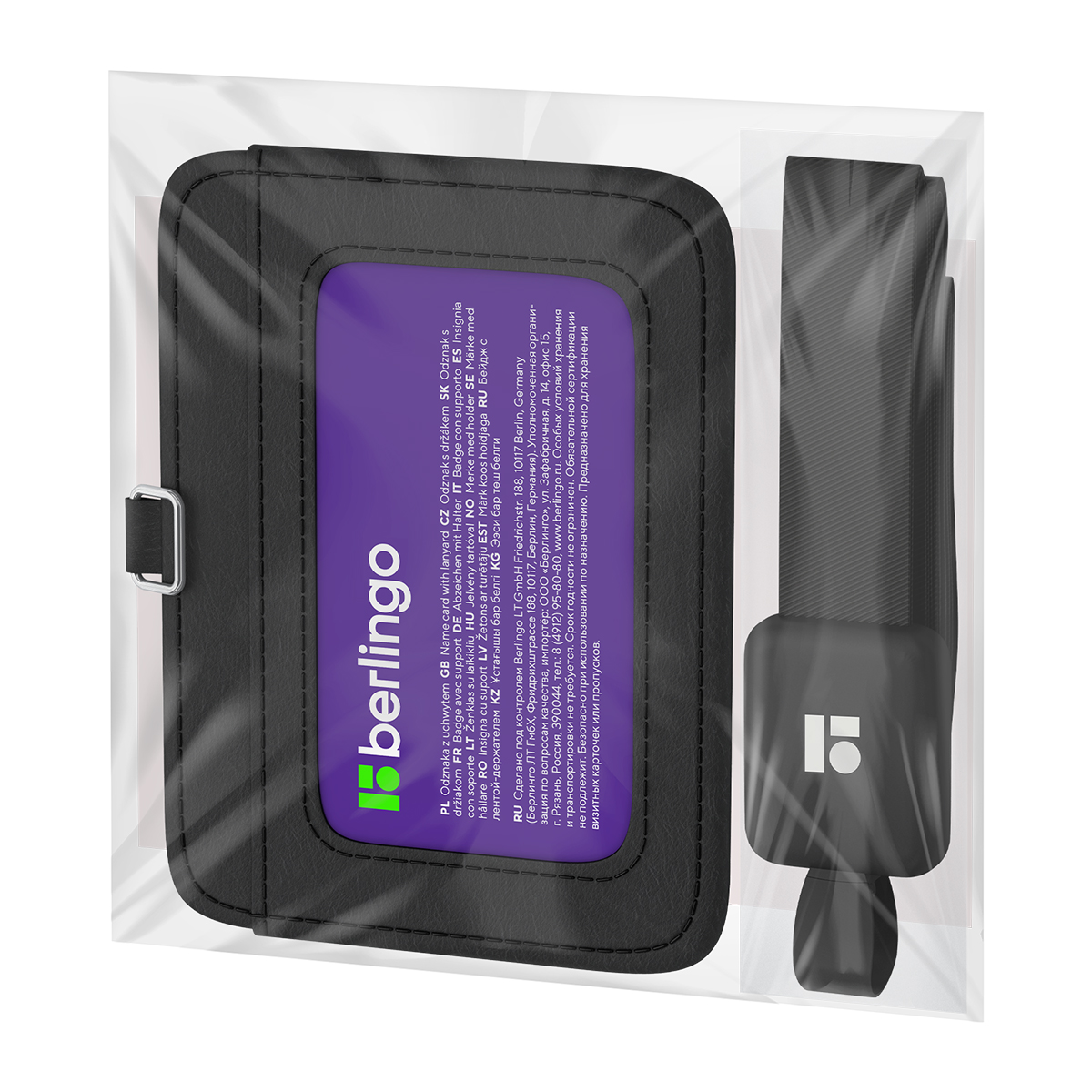 Бейдж горизонтальный Berlingo "ID 500", 85*55мм, PU, держатель-рулетка с лентой 45 см, черный