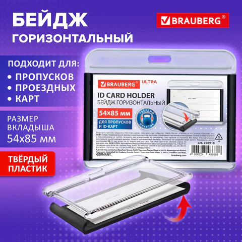 Горизонтальный бейдж BRAUBERG ULTRA для хранения пропусков и карточек сотрудников, ID-карт, проездных и банковских карт.