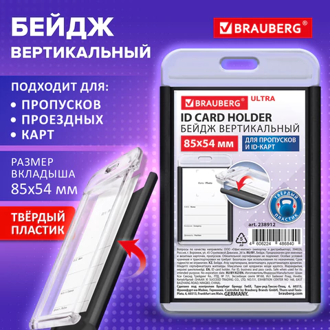 Вертикальный бейдж BRAUBERG ULTRA для хранения пропусков и карточек сотрудников, ID-карт, проездных и банковских карт.