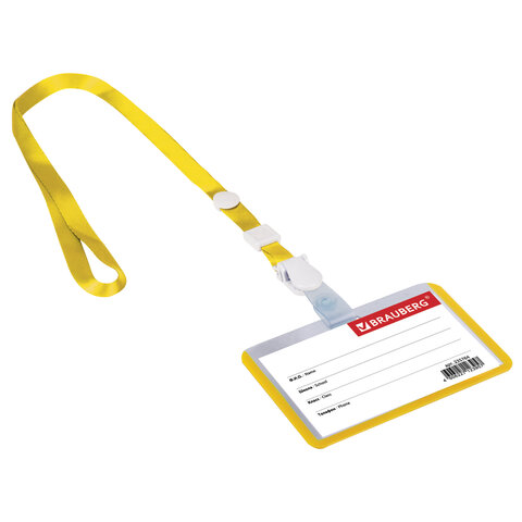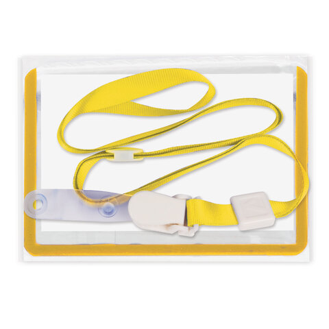 Комплектуется специальной нейлоновой лентой со съемной клипсой. Бейдж можно носить на ленте, либо крепить на одежду с помощью клипсы. Размер вкладыша 55х90 мм. Длина ленты 45 см, цвет ленты - желтый. Упакован в пластиковый пакет.