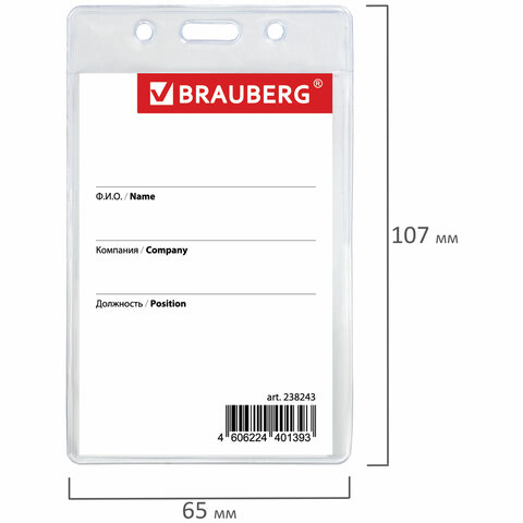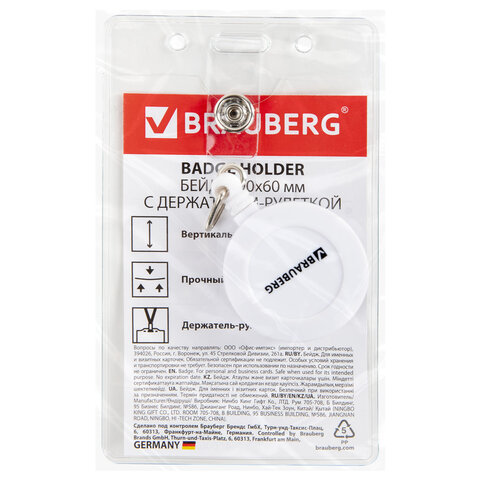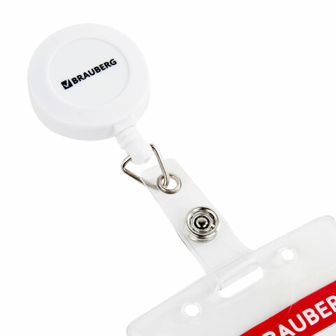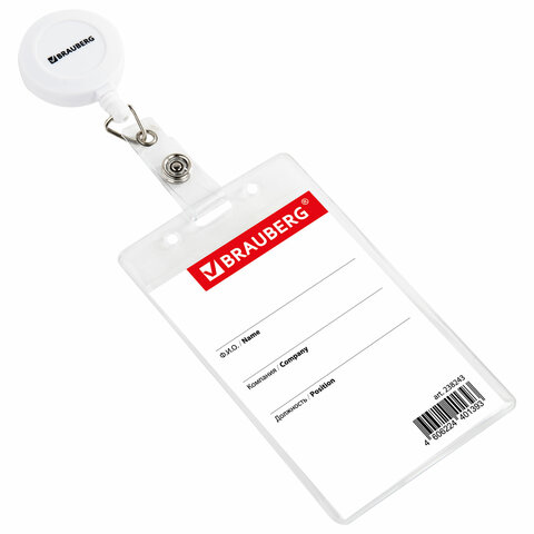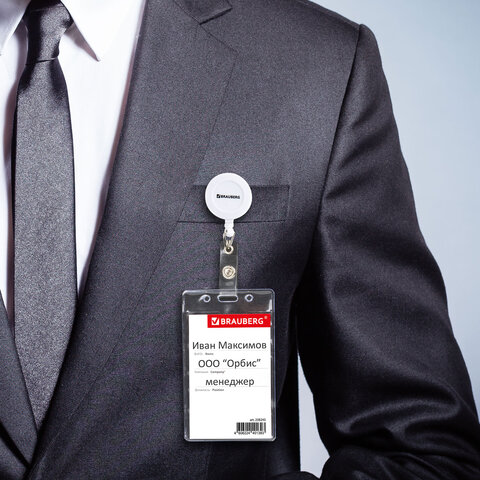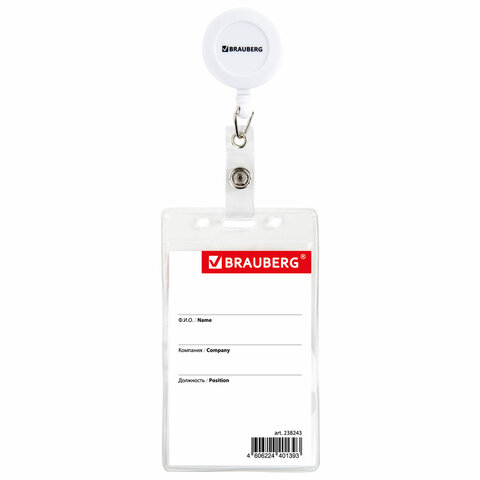 Вертикальный бейдж BRAUBERG на держателе-рулетке используется для размещения именных карточек, пропусков, пластиковых карт.