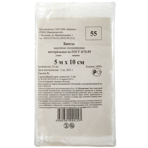 Бинт марлевый нестерильный NEW LIFE КОМПЛЕКТ 25 шт., 5 м х 10 см, плотность 36 (±2) г/м2, 213779