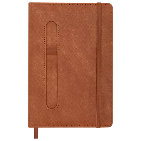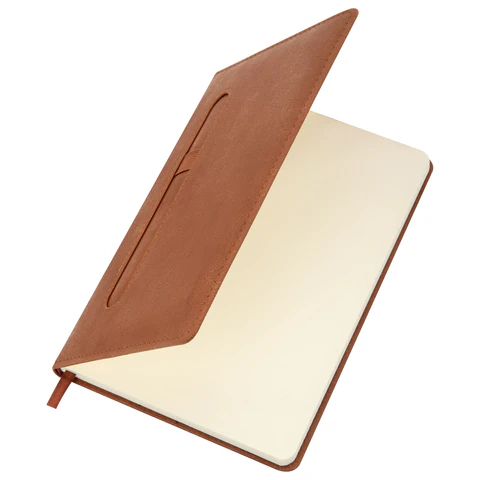 Внутренний блок включает 80 листов тонированной бумаги в клетку, плотностью 70 г/м2. Благодаря стандартному формату А5 (148х218мм) блокнот удобно использовать как в офисе, так и на выездных деловых встречах. Твердая обложка стилизована под старинную кожу в рубчик и выполнена в стильном коричневом цвете. Подходит для горячего тиснения.