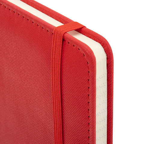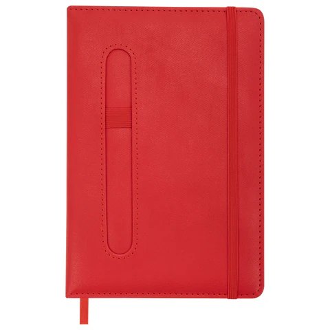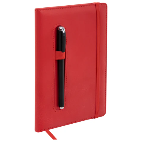 Внутренний блок включает 80 листов тонированной бумаги в клетку, плотностью 70 г/м2. Благодаря стандартному формату А5 (148х218мм) блокнот удобно использовать как в офисе, так и на выездных деловых встречах. Твердая обложка стилизована под старинную кожу в рубчик и выполнена в стильном красном цвете. Подходит для горячего тиснения.
