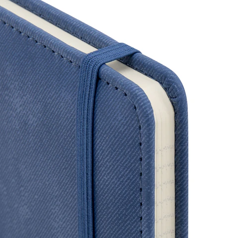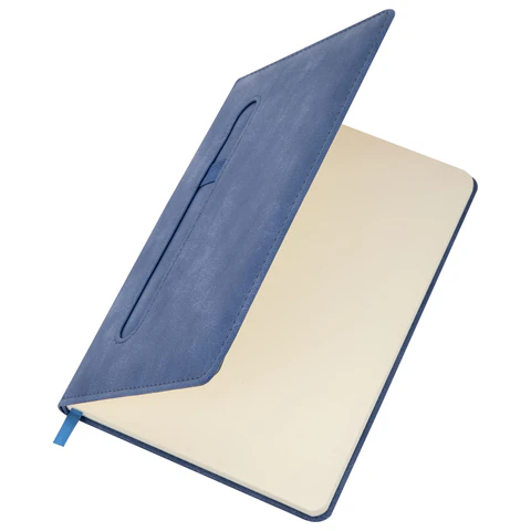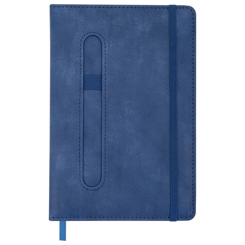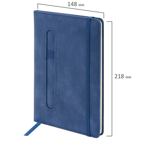 Внутренний блок включает 80 листов тонированной бумаги в клетку, плотностью 70 г/м2. Благодаря стандартному формату А5 (148х218мм) блокнот удобно использовать как в офисе, так и на выездных деловых встречах. Твердая обложка стилизована под старинную кожу в рубчик и выполнена в стильном синем цвете. Подходит для горячего тиснения.