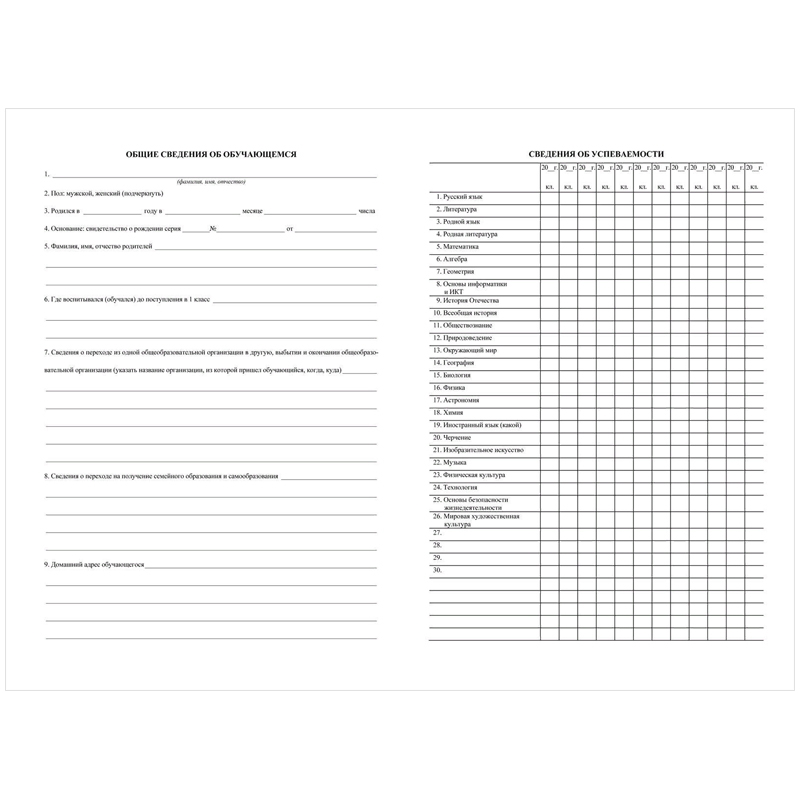 Личная карточка обучающегося. Формат А4. 2 листа. Блок - офсетная бумага, 160 г/м2.