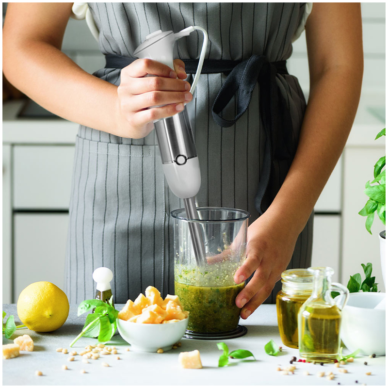 REDMOND RHB-2973 – современный блендер «4 в 1» с расширенным набором многофункциональных сменных насадок. В комплект помимо классических венчика, блендера и измельчителя входит специальная насадка для приготовления пюре. В отличие от блендера, она не взбивает отварные овощи в полужидкую массу, а равномерно перетирает их. Пюре получается нежным и воздушным – таким будто его приготовили вручную.