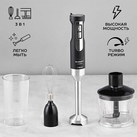 Погружной блендер SCARLETT SC-HB42F61 оснащён мощным мотором высокой мощности 1100 Вт, к нему прилагается мини-измельчитель, мерный стакан и венчик, с помощью которых можно измельчать продукты, готовить тесто, взбивать крем и выполнять другие задачи.