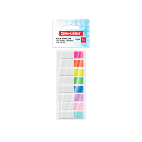Закладки клейкие прозрачно-цветные BRAUBERG, 45х12 мм, 120 штук (8 цветов х 15 листов), 116675