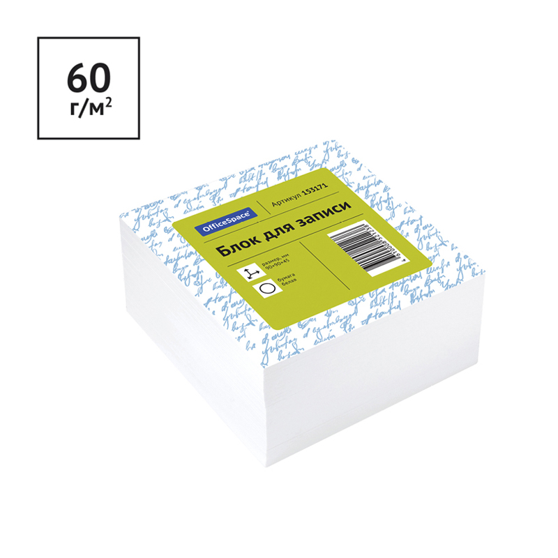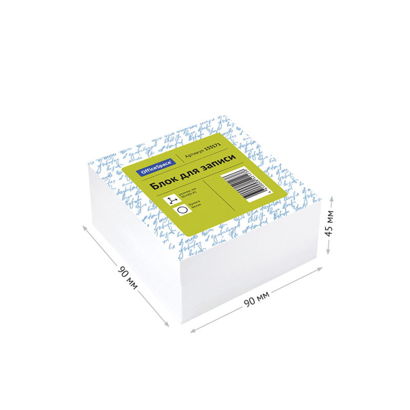 Блок бумаги подходит для оперативных записей любыми видами ручек и карандашей. <br/>Размер листа в блоке - 90х90 мм, высота блока - 45 мм. Наиболее удобен при использовании в настольных органайзерах и пластиковых подставках. Блок для записей представлен в индивидуальной упаковке в термоусадочной пленке.<br/>∙ Цвет блока: белый<br/>∙ Плотность бумаги: 60 г/м2.